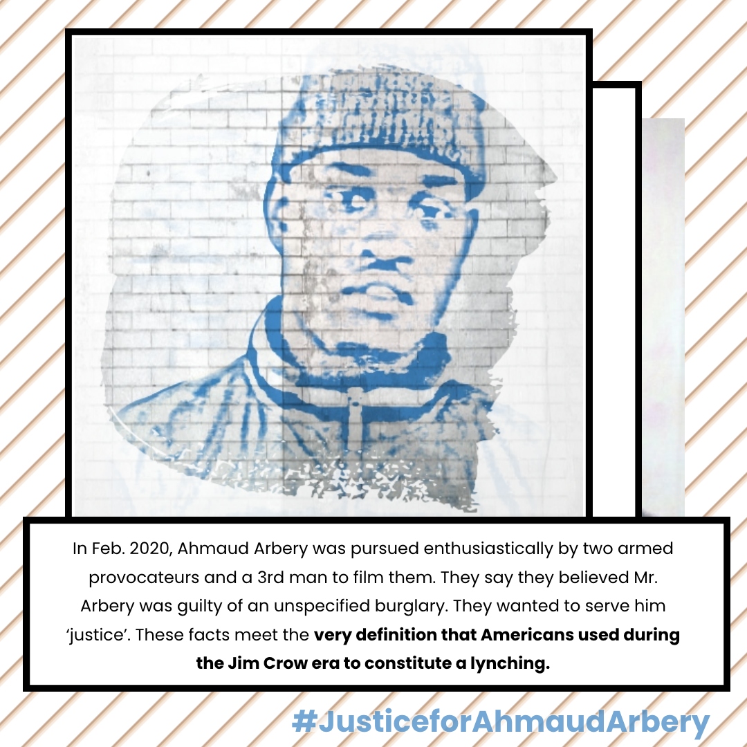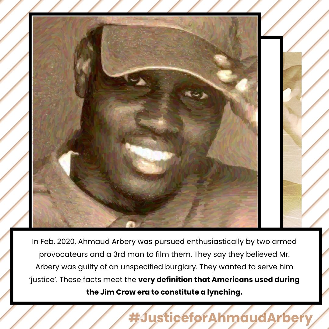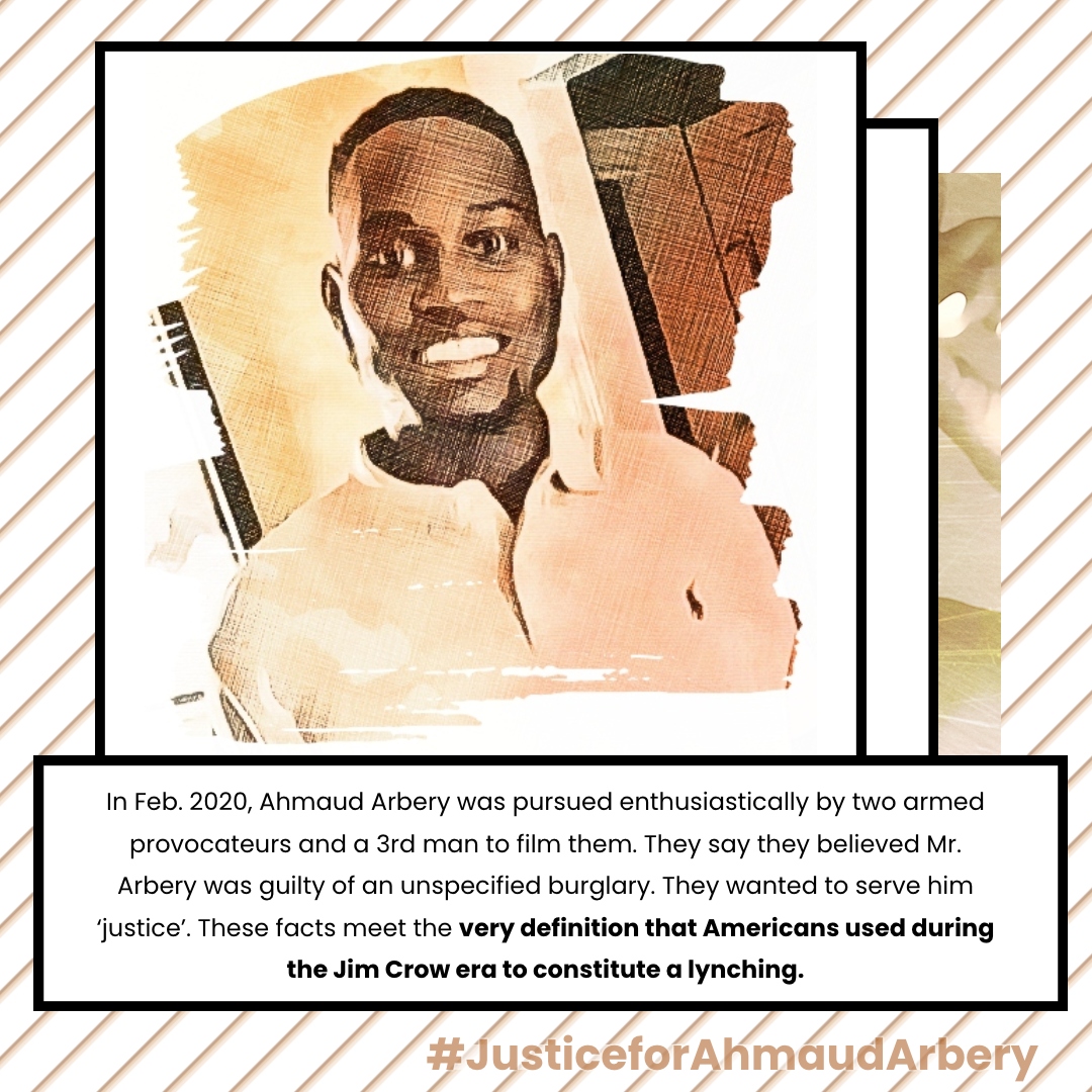 In Feb. 2020, Ahmaud Arbery was pursued enthusiastically by two armed provocateurs and a 3rd man to film them. They say they believed Mr. Arbery was guilty of an unspecified burglary. They wanted to serve him ‘justice’. These facts meet the very definition that Americans used during the Jim Crow era to constitute a lynching. |