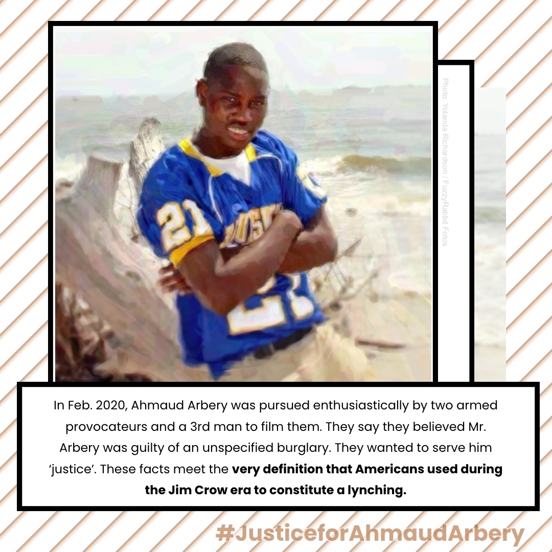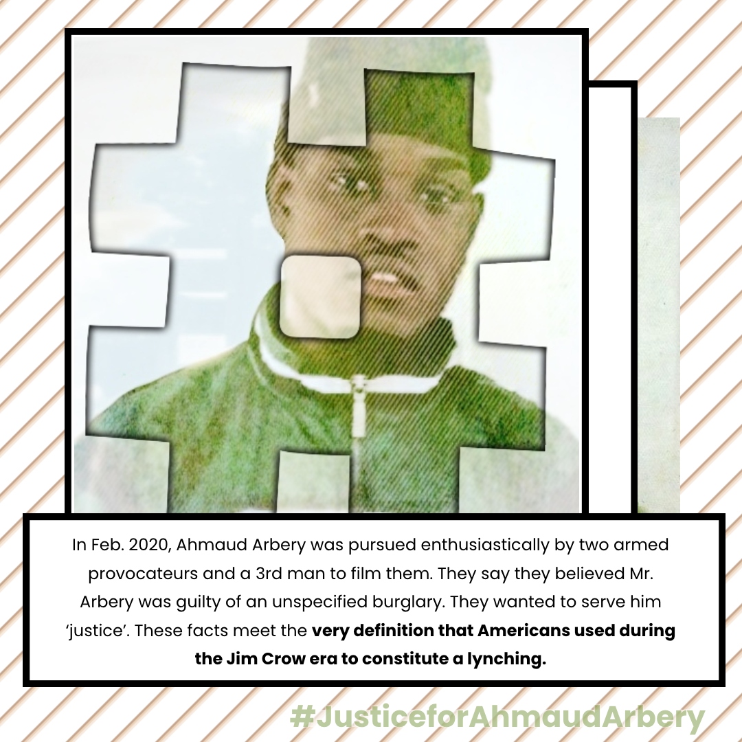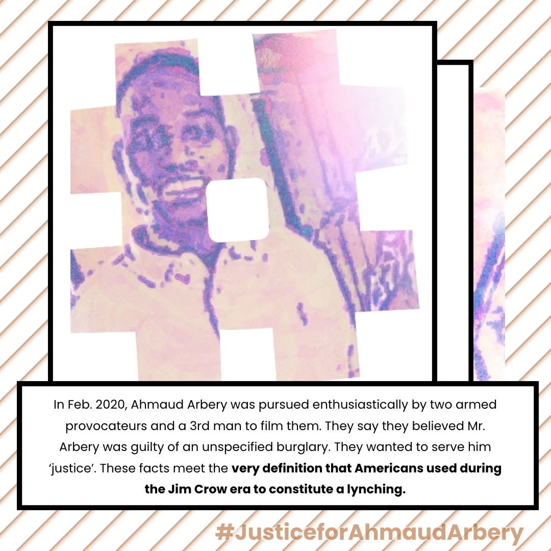 In Feb. 2020, Ahmaud Arbery was pursued enthusiastically by two armed provocateurs and a 3rd man to film them. They say they believed Mr. Arbery was guilty of an unspecified burglary. They wanted to serve him ‘justice’. These facts meet the very definition that Americans used during the Jim Crow era to constitute a lynching. |
